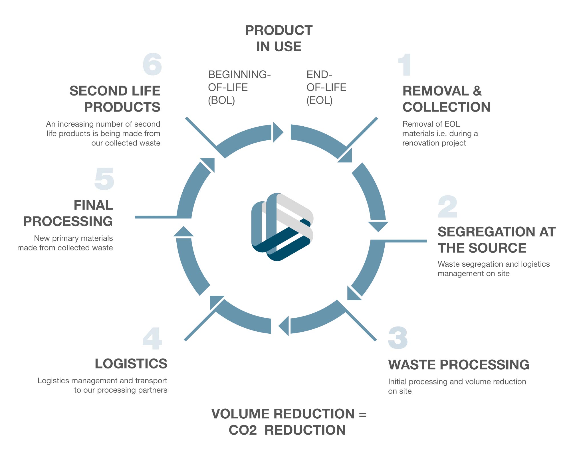 Our particular focus lies on EOL waste generated during renovation projects that still today despite all sustainability eff orts ends up being incinerated - leaving a substantial carbon foot print.